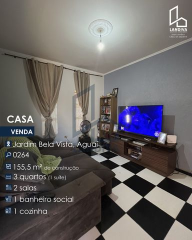 Casa à venda no bairro Jardim Bela Vista, em Aguaí, com 250 m² de terreno, sendo 155,5 m² de área construída. O imóvel possui 3 quartos, sendo 1 suíte, copa, sala de TV, 1 banheiro social, cozinha, área gourmet com churrasqueira, lavanderia e garagem com vaga para 3 carros.
