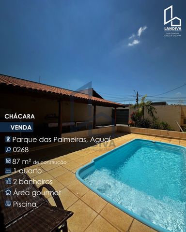 Chácara no bairro Parque das Palmeiras, em Aguaí, com 200 m² de terreno, sendo 87 m² de área construída. O imóvel possui 1 quarto, 2 banheiros, área gourmet e piscina.