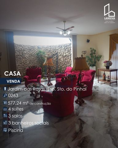 Casa à venda no bairro Jardim das Rosas, em Espírito Santo do Pinhal, com 722,00 m² de terreno, sendo 577,24 m² de área construída. O imóvel possui hall de entrada com porta dupla e lavabo, 4 suítes (sendo 2 com armários embutidos), sala de almoço, sala de jantar, sala de estar com 3 ambientes e pé direito duplo e acesso à piscina, lareira, 3 banheiros sociais, cozinha com despensa, lavanderia, quarto para empregada com banheiro, quintal espaçoso, academia, bar, escritório com 2 ambientes, jardim de inverno e garagem com vaga para 6 carros. A área gourmet possui churrasqueira, banheiro, jacuzzi e piscina com iluminação. Adicionais: madeiramento de primeira, cerca elétrica, portão eletrônico, 8 câmeras de segurança e aquecedor solar.